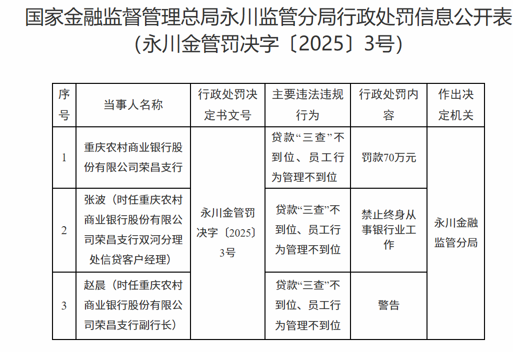 12月15日,国家金融监督管理总局永川监管分局行政处罚信息公开表显示,重庆农村商业银行股份有限公司荣昌支行因贷款“三查”不到位、员工行为管理不到位被罚款70万元;张某被禁止终身从事银行业工作;赵某被警告。